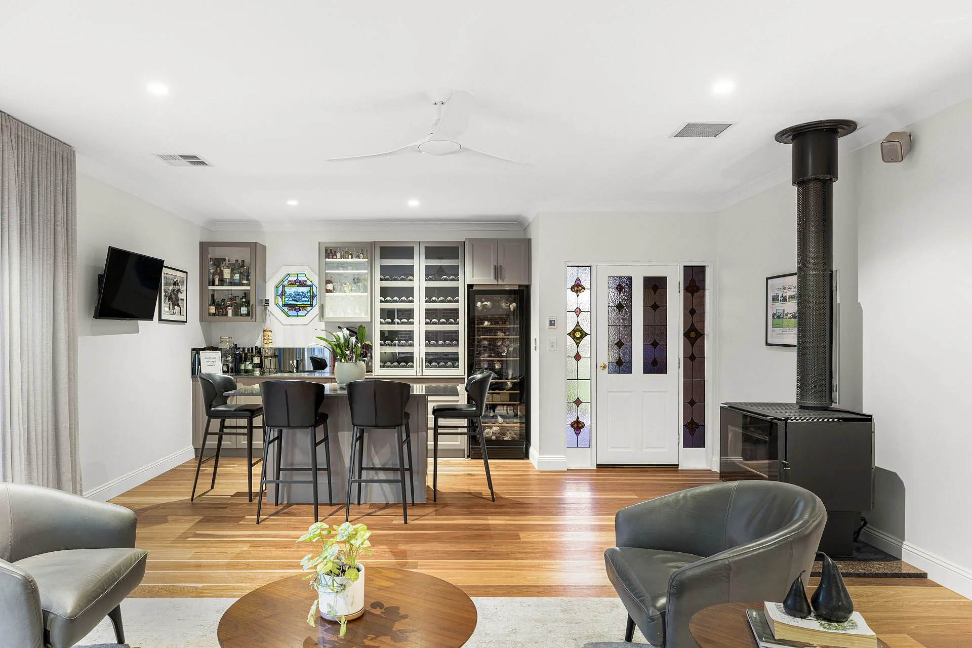 - Custom cabinetry/bar in living with sink, island bench and stone benchtops